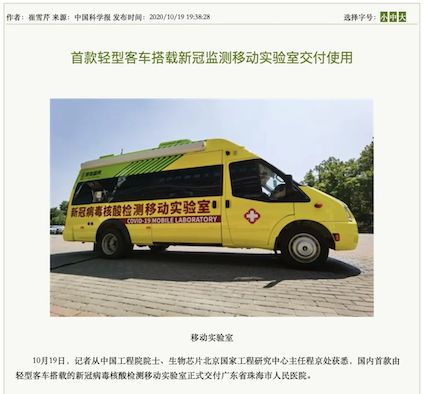 10月19日,“珠海市核酸檢測基地”在廣東省珠海市人民醫(yī)院正式揭牌啟用。揭牌儀式上,由清華大學(xué)、生物芯片北京國家工程研究中心和北京博奧晶典生物技術(shù)有限公司共同自主研發(fā)的首款輕型客車搭載的全集成新冠檢測移動實驗室正式亮相。