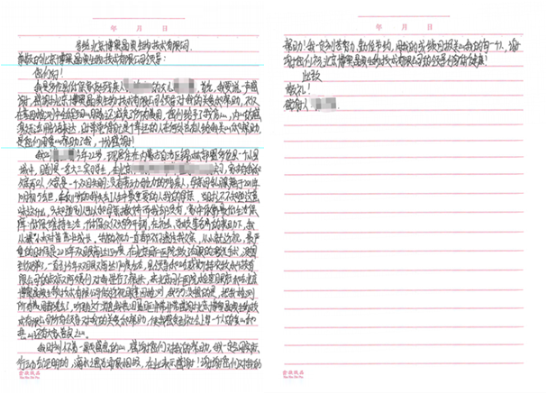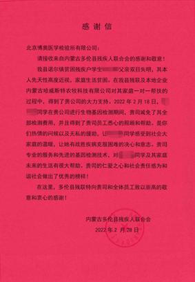 我縣諾爾鎮(zhèn)貧困殘疾戶學生xxx父親雙目失明,其本人先天性高度近視,家庭生活貧困。在我縣殘聯(lián)及本地企業(yè)內蒙古哈維斯特農牧科技有限公司對其家庭一對一幫扶的過程中,得到了貴公司的大力支持。2022年2月18日,xxx同學在貴公司進行生物基因檢測期間,貴司減免了其全部檢測費用,并且得到了貴司員工悉心的照顧和幫助。是你們熱情的問候以及無私的援助,讓xxx同學感受到社會大家庭的溫暖,讓她有戰(zhàn)勝疾病克服困難的決心和意志。貴司專業(yè)的服務和先進的基因檢測技術,對xxx同學及其家庭未來的生活有很大幫助。貴司的仁愛之心和社會責任感為和諧社會做出了優(yōu)秀的榜樣!