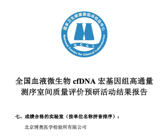 今日,國家衛(wèi)生健康委臨床檢驗(yàn)中心(以下簡稱“臨檢中心”)公布了2023年“全國血液微生物cfDNA宏基因組高通量測序室間質(zhì)量評價(jià)預(yù)研活動(dòng)結(jié)果報(bào)告”。博奧晶典旗下北京博奧醫(yī)學(xué)檢驗(yàn)所順利通過本次室間質(zhì)評,并且檢測病原體與樣本預(yù)期結(jié)果完全一致。