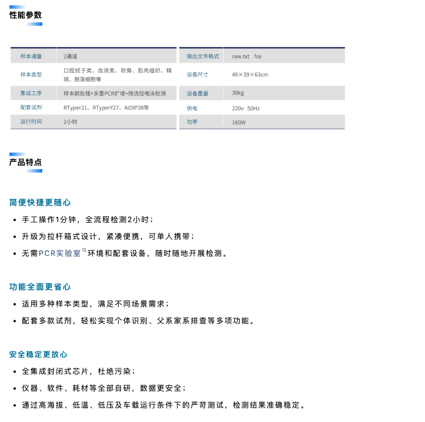 該設(shè)備采用拉桿箱式設(shè)計(jì),可由單人攜帶使用,適用于戶外、車載、高原環(huán)境等,是國(guó)際首款“可移動(dòng)法醫(yī)DNA實(shí)驗(yàn)室”,為全球公共安全部門在現(xiàn)場(chǎng)物證檢驗(yàn),重點(diǎn)人員篩查、重大公共安全事件的快速處置、出入境邊防檢查等應(yīng)用場(chǎng)景增添強(qiáng)勁利器。