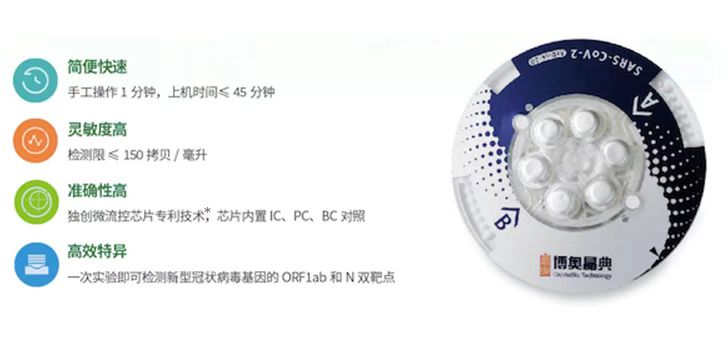 本產(chǎn)品采用博奧自主研發(fā)的微流控集成式核酸提取純化和高靈敏度擴(kuò)增檢測技術(shù),由國家科技部“新型冠狀病毒感染的肺炎疫情應(yīng)急項(xiàng)目”支持,能快速精準(zhǔn)地完成對新型冠狀病毒的“樣本進(jìn)—結(jié)果出”式全自動(dòng)、全密閉檢測。特殊工藝制作的微流控芯片上集成了樣本裂解、核酸提取、巢式擴(kuò)增和熒光檢測等功能,通過芯片巢式恒溫?cái)U(kuò)增技術(shù),實(shí)現(xiàn)對痕量病毒核酸高敏擴(kuò)增和檢測,每張芯片可檢測兩個(gè)樣本,能在45分鐘內(nèi)一步完成全程實(shí)驗(yàn),達(dá)到對新型冠狀病毒核酸的快速檢測。(國械注準(zhǔn):20213400101)
